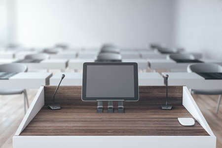 Speech stand with microphone and digital tablet with blank screen in conference room. Presentation and education concept. 3D Rendering