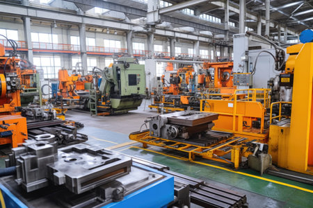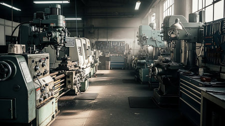 Explore the vastness of an industrial workshop filled with diverse machinery. The dim lighting and organized layout reflect the efficiency of manufacturing processes and technology.