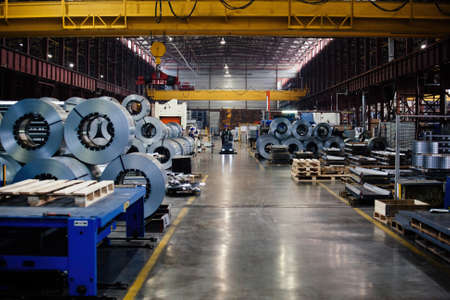Metalworking factory production line. Rolls of steel and metal profiled parts in workshop.