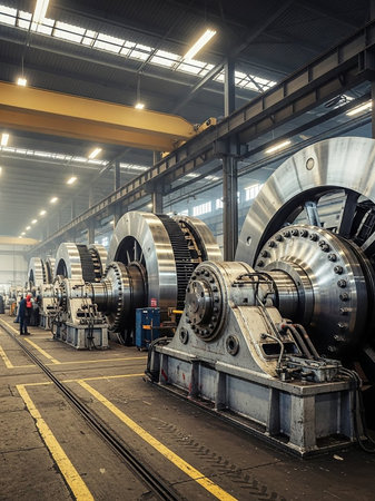 A vibrant depiction of industrial machinery within a factory, highlighting large turbines and advanced equipment, focusing on technology and manufacturing processes.