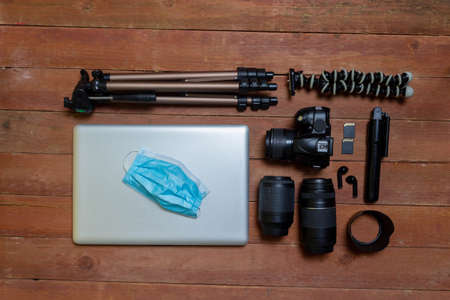 work space photographer. Photographic equipment on desk, with camera, lenses, laptop, tripods and face mask due to pandemic