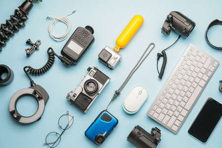 Top View of Photographers, Videographers or Video Bloggers Workplace. Digital Gadgets Lying on Blue Table - Flat Lay