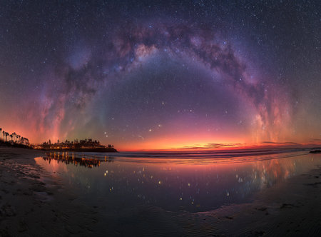 Night sky over a calm ocean reflecting the galaxy, shore lights below a colorful sunset