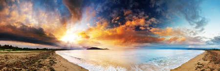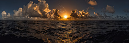 Expansive ocean view wrapped in a surreal 360-degree panorama under a vibrant dawn sky. A.I.