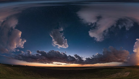 Generative AI : Seamless dark sky after sunset hdri panorama 360 degrees angle view with beautiful clouds with zenith for use in 3d graphics or game as sky dome or edit drone shot