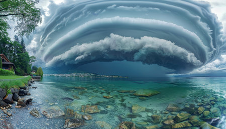 A vast and imposing storm cloud looms ominously over a serene lake, with a cozy house situated in the background