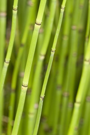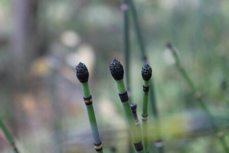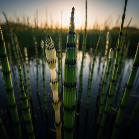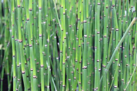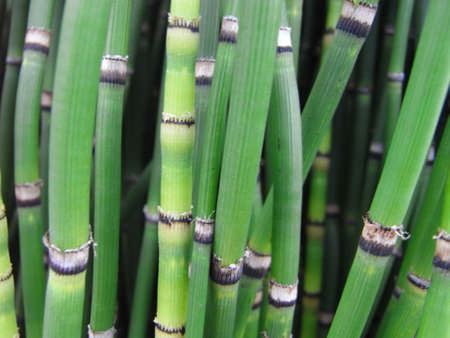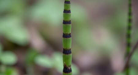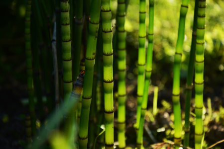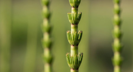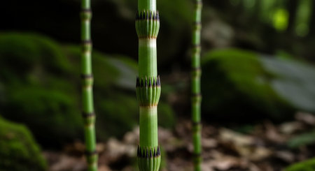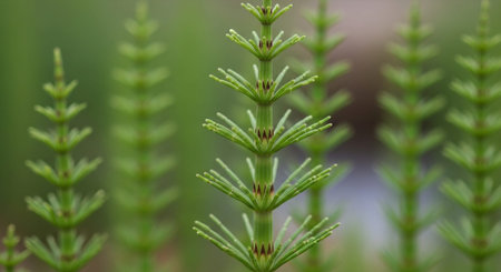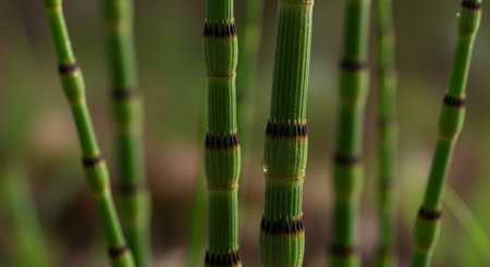 A detailed macro shot showcasing the intricate structure and lush green color of horsetail plants, highlighting their unique segmented stems and delicate foliage.