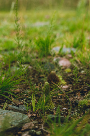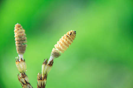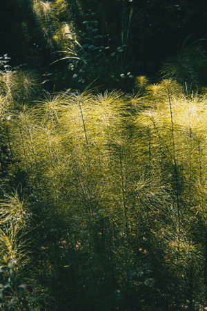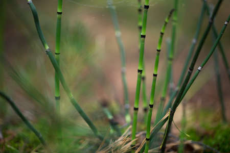 Close-up of young equisetum (horsetail, snake grass, puzzlegrass) in the forest lit by sunlight in spring