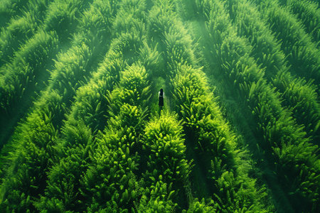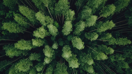 Mesmerizing aerial view of a dense forest, showcasing the intricate patterns and textures of vibrant green trees, ideal for nature-themed projects and backgrounds.