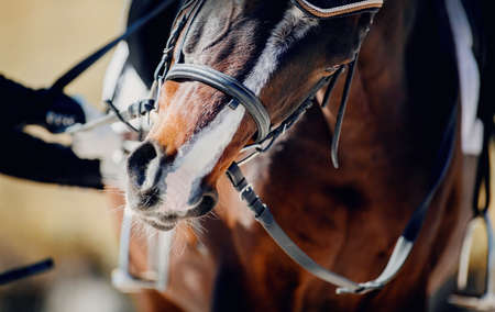 The nose of a bay horse with a white groove on the muzzle. Portrait sports stallion in the bridle. Horse muzzle close up. Dressage horse. Equestrian sport. Horse riding.