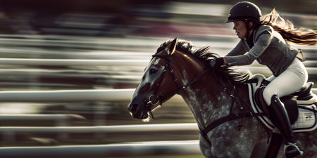 side view of young woman riding horse in racehorse competition, equestrian sport background with copy space