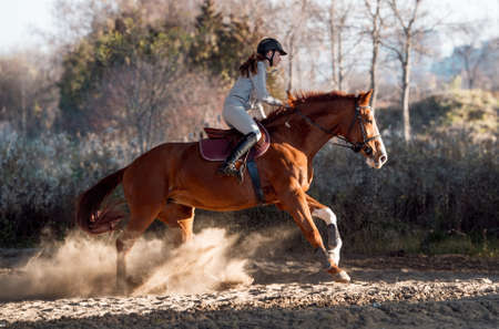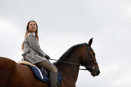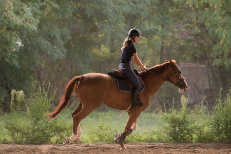 Female horse rider riding outdoors on her lovely horse