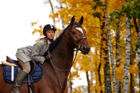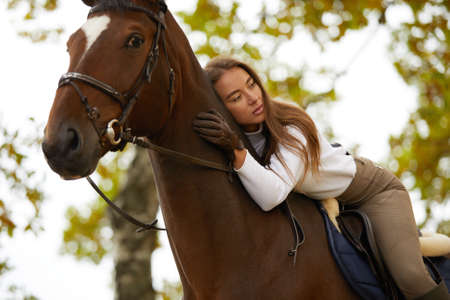 Portrait of a pretty young woman with a brown horse riding autumn day