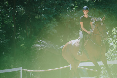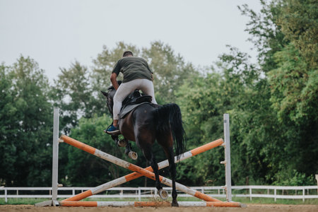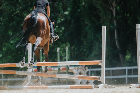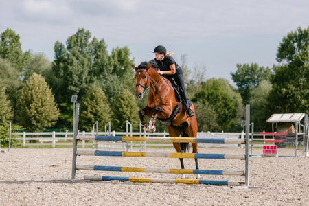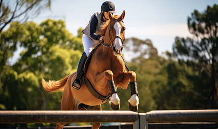 Equestrian jumping competition with horse rider overcoming obstacle in sunny outdoor setting