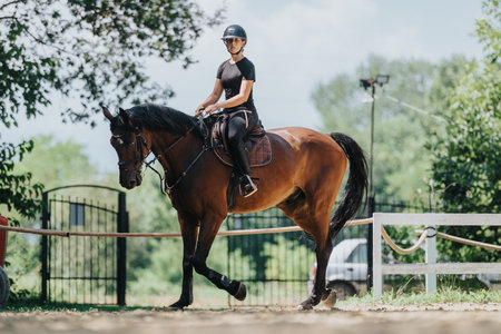 Young rider enjoying a sunny day riding a horse in an outdoor equestrian arena