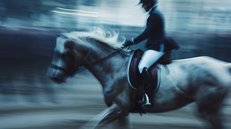 Hazy view of a rider and their powerful steed displaying perfect harmony and coordination at a horseback riding show