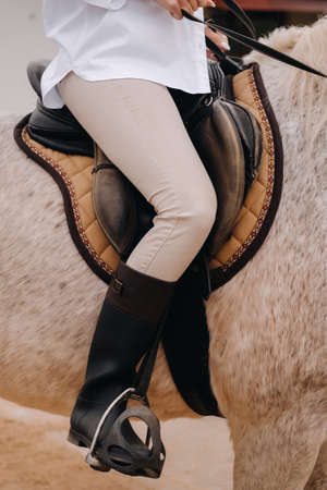 Close-up of a rider's legs in stirrups. A woman on a horse.
