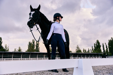 Young sportive girl, professional jockey or horsewoman in sports uniform and helmet with black horse at riding arena. Horseback riding