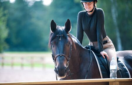 Young pretty cheerful girl resting after horseback riding training on arena. Vibrant colored outdoors horizontal summertime image with vintage filter