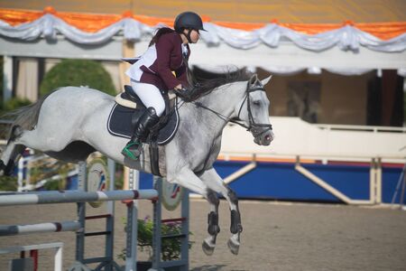BANGKOK,THAILAND - NOVEMBER 24,2018 : Unidentified woman jockey on a horse successfully completed the jump across barrier during Princess’s Cup Thailand 2018 Competition at Sanam Pao stadium in Bangkok , Thailand.