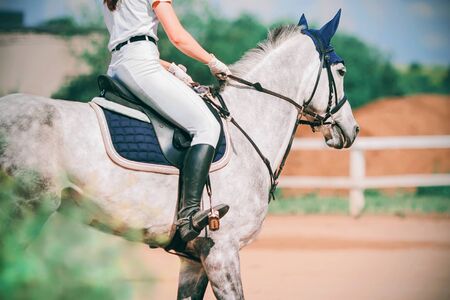 Horse and rider in uniform. Beautiful white horse portrait during Equestrian sport show jumping competition, copy space.