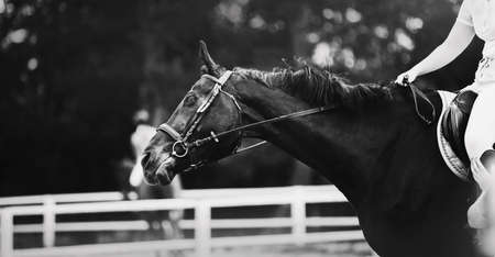 A black and white image of a beautiful black horse with a bridle on its muzzle and a rider in the saddle. horse riding.