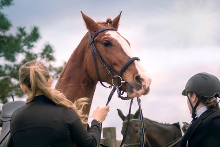 two girls hold a horse by the bridle, before an equestrian competition