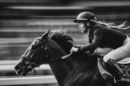 Black and white image of female equestrian riding a horse during a race. Concept of horseback riding, equestrian sport, equine competition, racing.