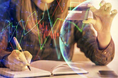 Double exposure of businesswoman hands typing on computer and forex chart hologram drawing. Financial analysis concept.
