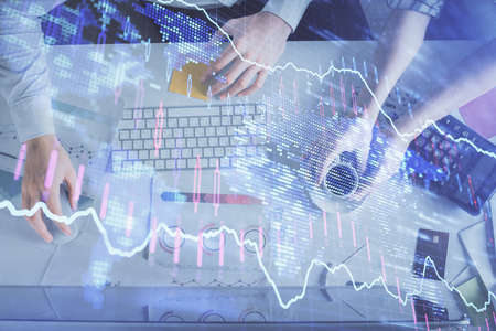 Double exposure of man and woman working together and financial chart hologram drawing. market analysis concept. Computer background. Top View.