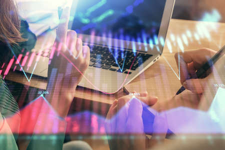 Double exposure of man and woman working together and forex chart hologram. Business concept. Computer background.