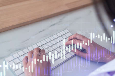 Woman typing the keyboard to research stock market to proceed right investment solutions. Internet trading and wealth management concept. Formal wear. Hologram Forex chart over close up shot.