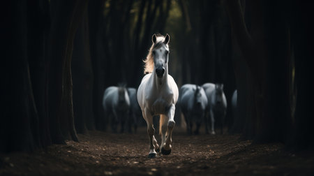 A white horse is captured in motion, running towards the viewer. The image showcases a natural daylight scene, the subject stands out against a darker background of trees and other horses. This composition is suitable for editorial and commercial applications.