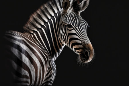 One zebra on a black background, seen from the side. Black and white art photography, striped animal pattern, african wild nature monochrome wallpaper, copy space. Generative AI