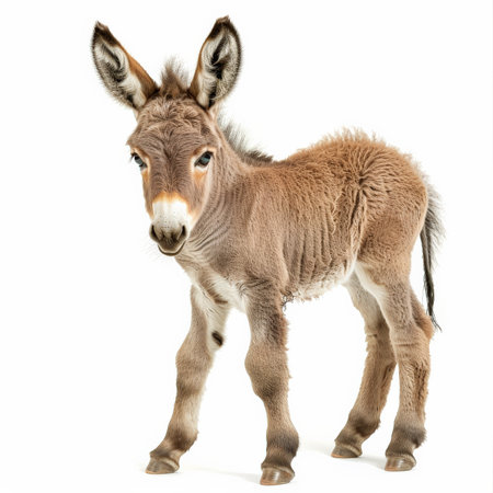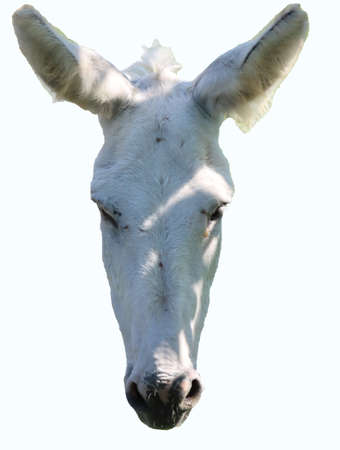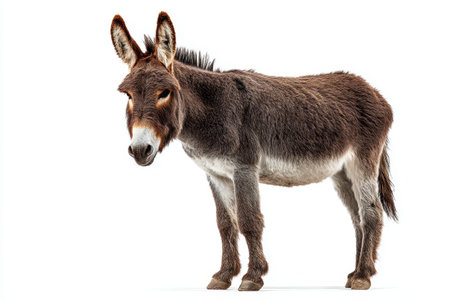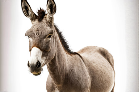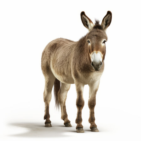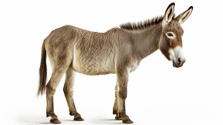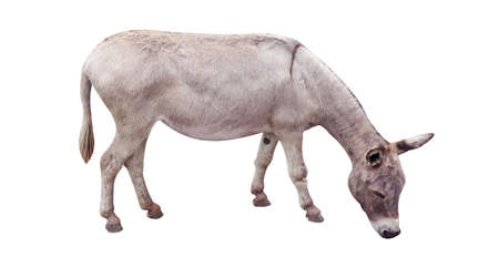 Donkey full length isolated on white. Funny gray donkey standing and looking into camera. Farm animals. Copy space