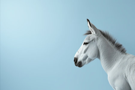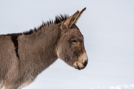 The donkey exhibits a calm demeanor, its profile highlighted against a soft, snowy backdrop. This tranquil moment captures the essence of winter and rural life.