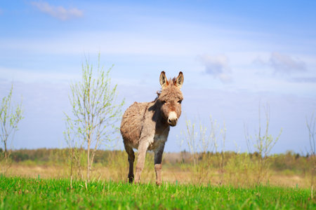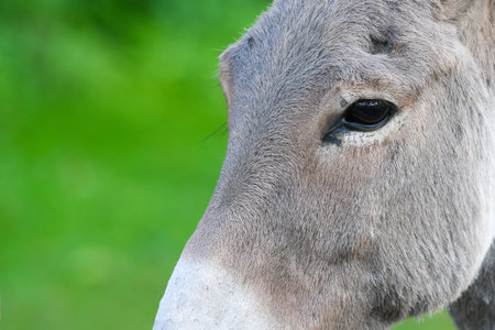 A beautiful grayish donkey on a green pasture in nature looking at camera
