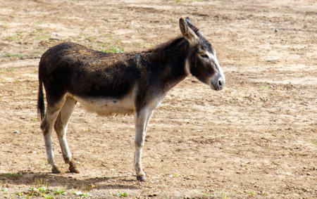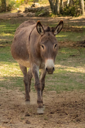 Donkey walking around its enclosure on safari. Free-roaming animals in the safari park.