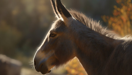 Yellow fall season color in background of mini donkey profile view close up on farm.