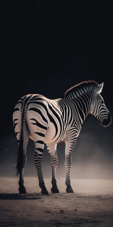 One zebra on a black background, seen from the side. Black and white art photography, striped animal pattern, african wild nature monochrome wallpaper, copy space. Generative AI