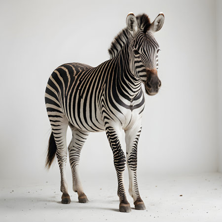 A zebra stands confidently showcasing its distinctive stripes in a stunning black and white contrast. The animal gazes directly at the viewer.