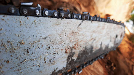 Chainsaw with an iron chain saws wood with a blurry background