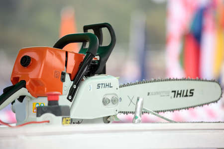 Raubichi, Minsk region, Belarus - August 25, 2012: Chainsaw is prepared for fitting another chain during World Logging Championship in Raubichi, Minsk region, Belarus at August 25, 2012