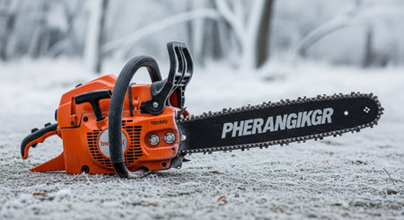 An orange chainsaw lies on a surface covered in frost and scattered leaves. The background a blurred winter forest with bare trees and a soft, diffused light. The focus is on the detailed texture of the chainsaw and the cold, crisp environment.