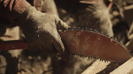 A close-up image capturing the hands of a worker using a hand saw to cut wood in an outdoor setting. The scene illustrates craftsmanship and labor in nature.
