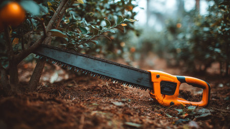 A handsaw leans against a citrus tree in a tranquil garden setting. The lush greenery and soft light create a serene atmosphere perfect for gardening enthusiasts.