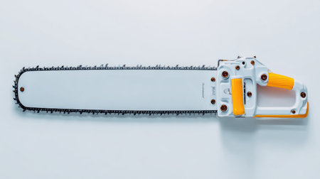 A vibrant image of an industrial chainsaw resting on a smooth surface with a colorful background, highlighting its design and functionality for various tasks.