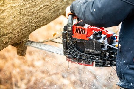 foreman in work clothes cuts a dry tree with a chainsaw for later processing. Woodcutting in the forest. Close-up of chainsaw at work. Sawdust flies out from the chain.