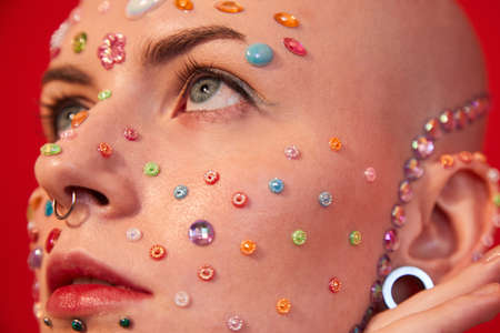 Modern beauty portrait. Young woman with shaved head. Colored gel fashion look
