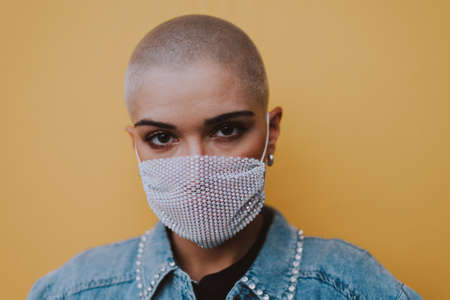 Pretty girl with stylish clothes posing - Beautiful woman with shaved head portrait